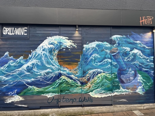 世界7カ国で腕を磨いたシェフの創作料理を味わえるワインバー「GRILL & WINE T’s」さんの外装に大波の壁画が施されています。